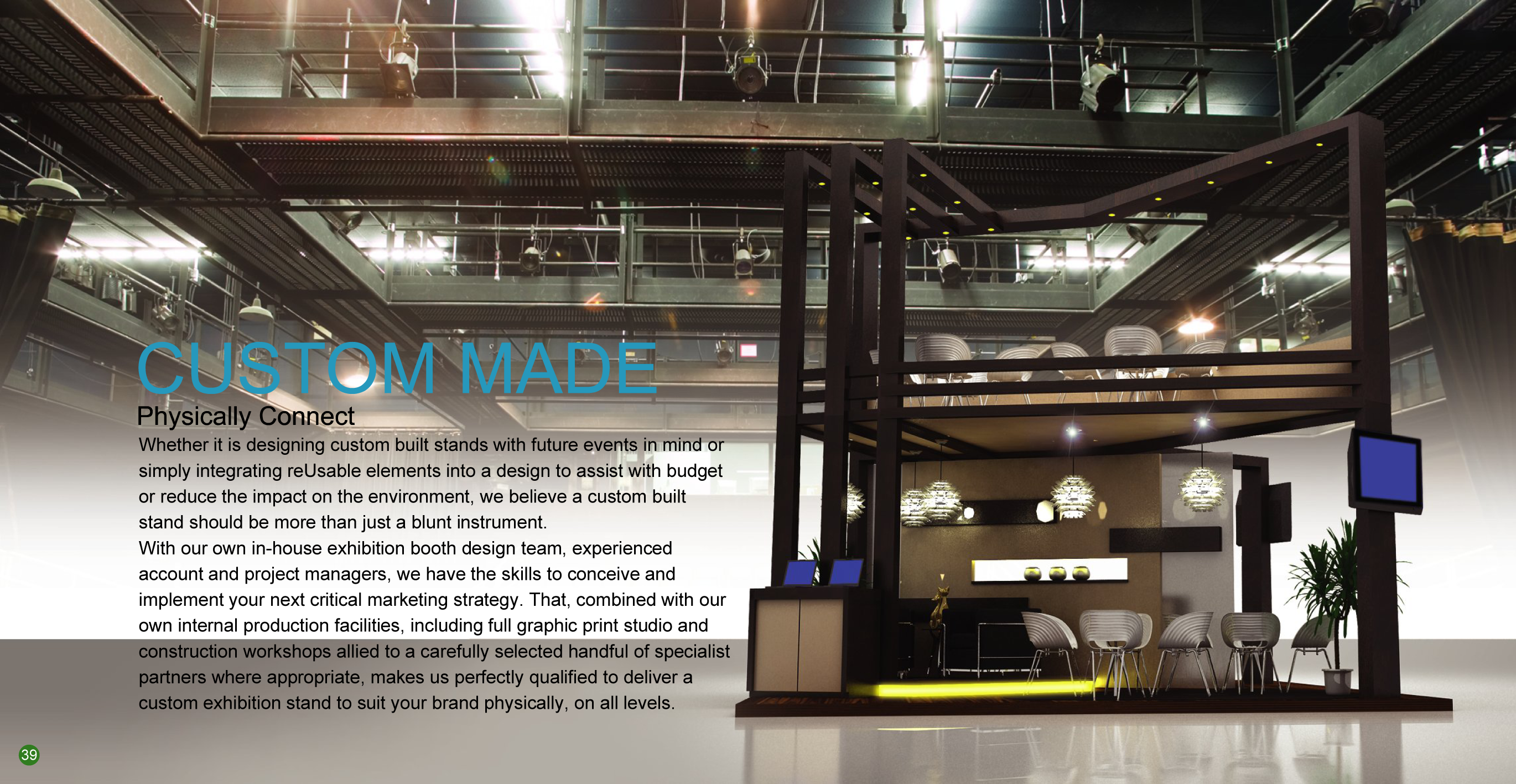 With our own in-house exhibition booth design team, experienced account and project managers, we have the skills to conceive and implement your next critical marketing strategy. That, combined with our own internal production facilities, including full graphic print studio and construction workshops allied to a carefully selected handful of specialist partners where appropriate, makes us perfectly qualified to deliver a custom exhibition stand to suit your brand physically, on all levels.