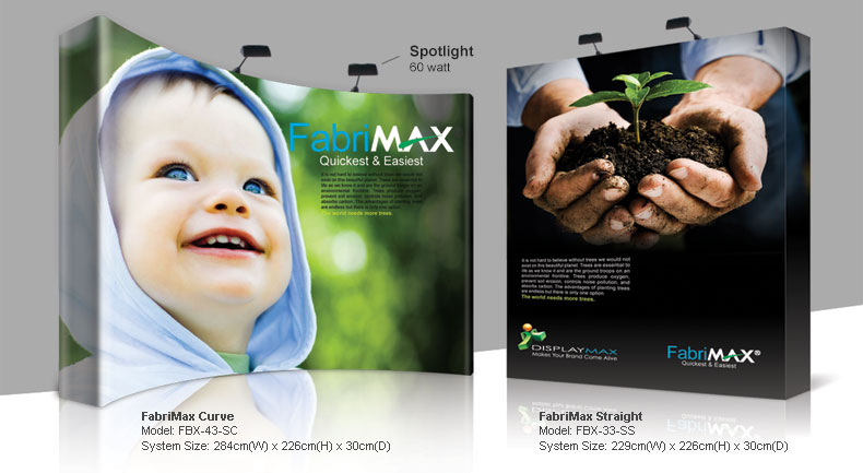 The FabriMax is a pop-up system with a seamless fabric graphic always attached to the frame, using Velcro. When the unit is set up, the graphic unfolds with the frame and stretches to form a completely smooth image across the entire display.